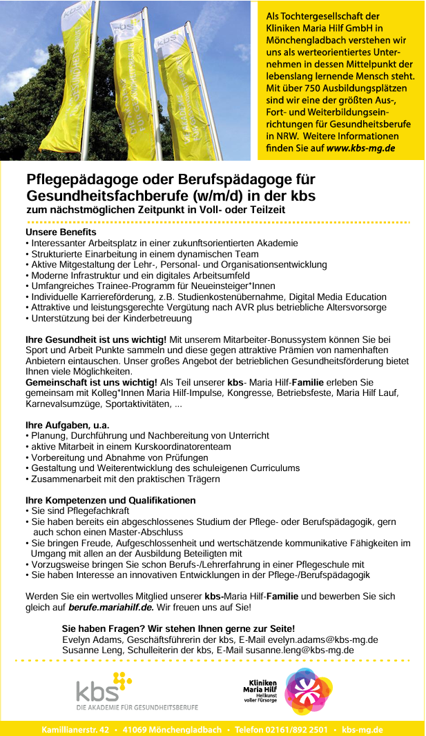 Als eine der größten Aus-, Fort- und Weiterbildungseinrichtungen für Gesundheitsfachberufe in NRW sucht die kbs zum nächstmöglichen Zeitpunkt einen Pflege- oder Berufspädagogen (w/m/d) in Voll- oder Teilzeit. Alle Details zur Stelle finden Sie in der untenstehenden Stellenanzeige.